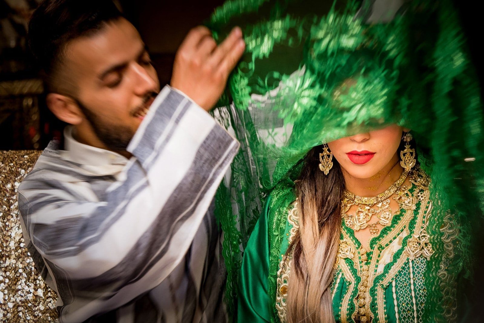 circondata dai suoi parenti stretti, la sposa indossa il caftano verde e oro per la